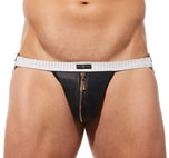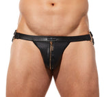 Truly an amazing jock! The Solid Gold Jock is one of our favourites and it is sure to be one of yours. Beautiful golden rings and a working golden zipper really bring the black faux leather alive! A must have for any jock lover or anyone that likes to see their play partner in one!